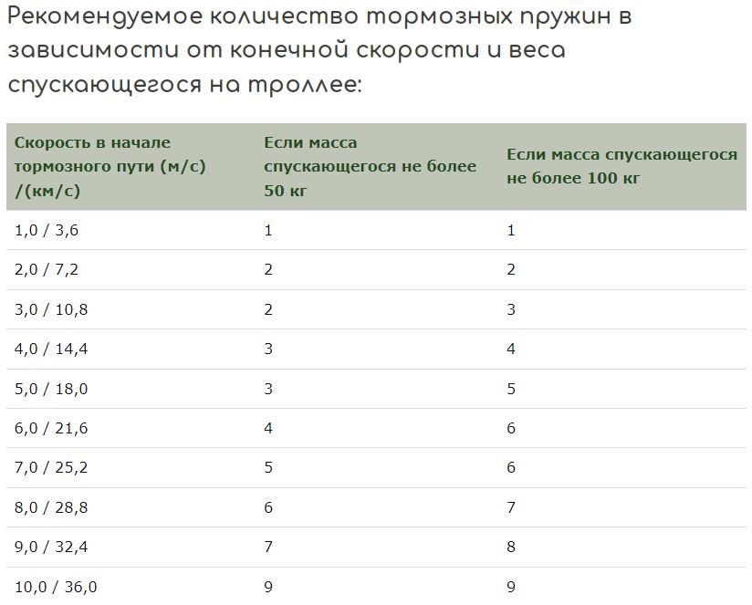 Минимальное рекомендованное количество пружин в комплекте — четыре. Таблица (в галерее) позволяет определить (ориентировочно) необходимое количество пружин для сегментной сборки каскадом в зависимости от конечной скорости каретки.