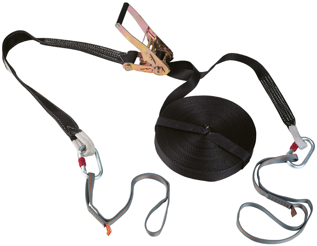 Оснащена стальным устройством для натяжения и двумя крепежными петлями из полиамида (арт.104065), а так же имеются два стальных карабина (арт.0981).