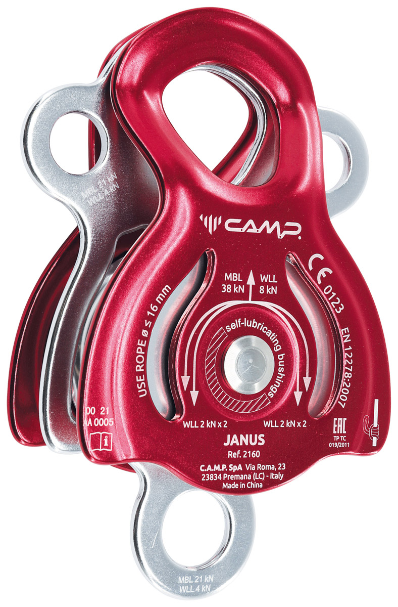 Увеличенный двойной блок-ролик от C.A.M.P. на латунной втулке. Удобен для построения полиспастных систем. Диаметр веревки до 16 мм. КПД 90%. Вес 405 г. Нагрузка 38 кН.- Вес: 405 гр.