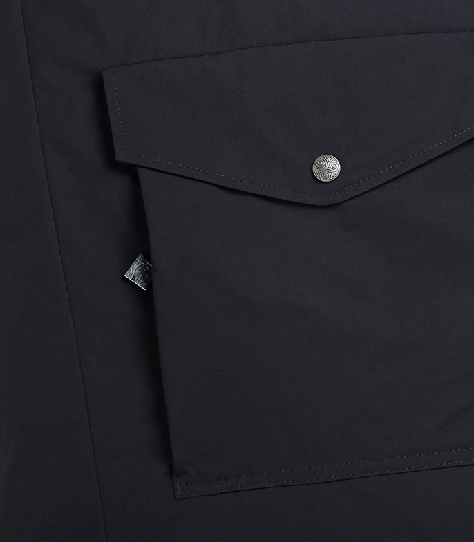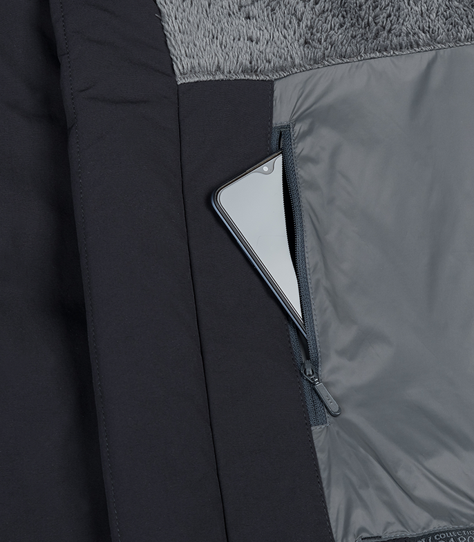 Два объёмных накладных боковых кармана с флисовой отделкой и клапанами на кнопках. Один нагрудный утеплённый карман