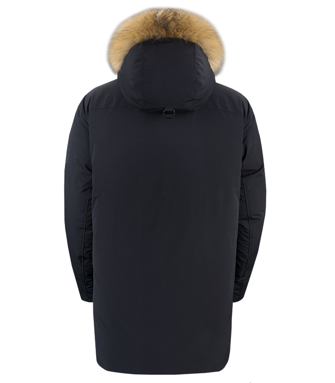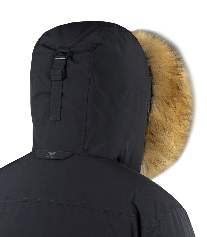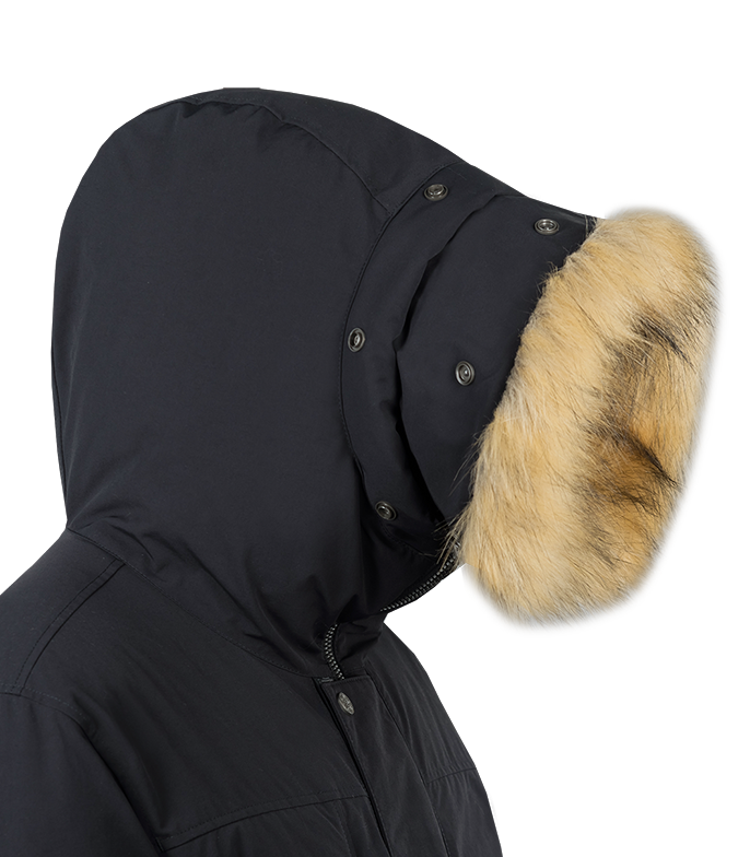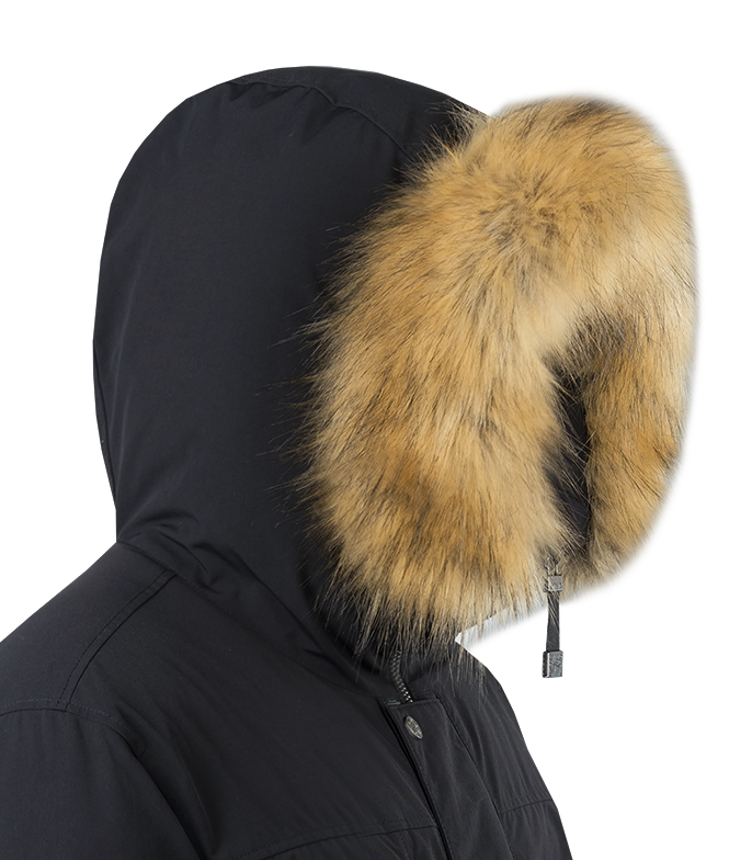 Удобный вытянутый капюшон парки хорошо защищает от бокового ветра и имеет съемную опушку из искусственного меха.