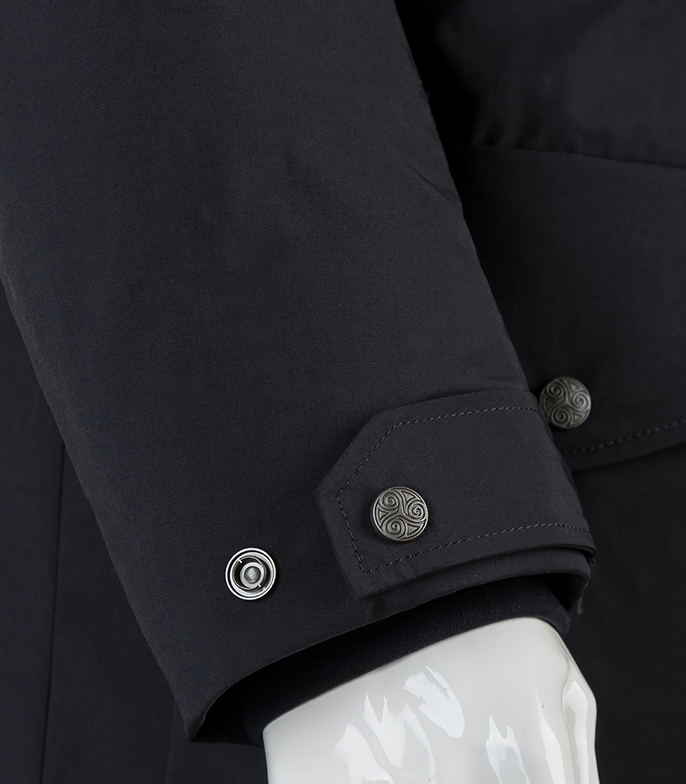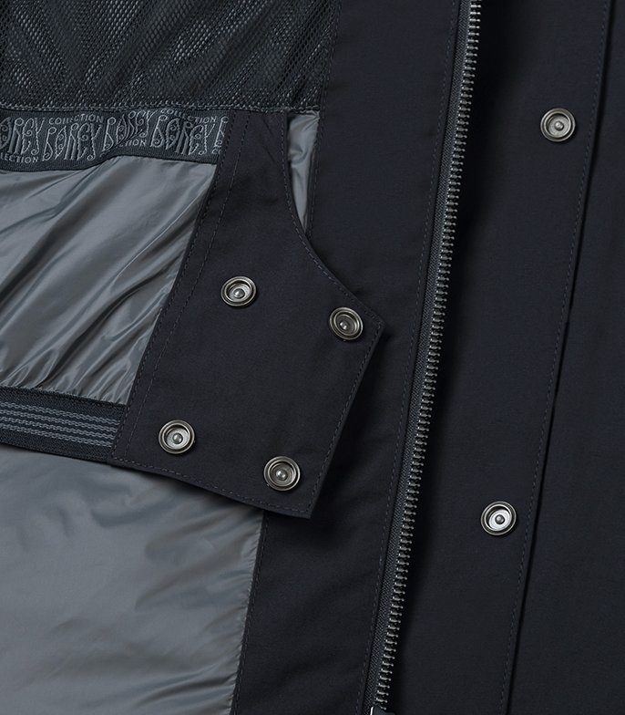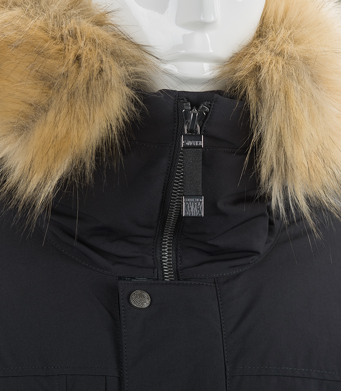 Центральная двухзамковая молния с внешней ветрозащитной планкой на кнопках и утеплённой внутренней планкой. Внутренняя