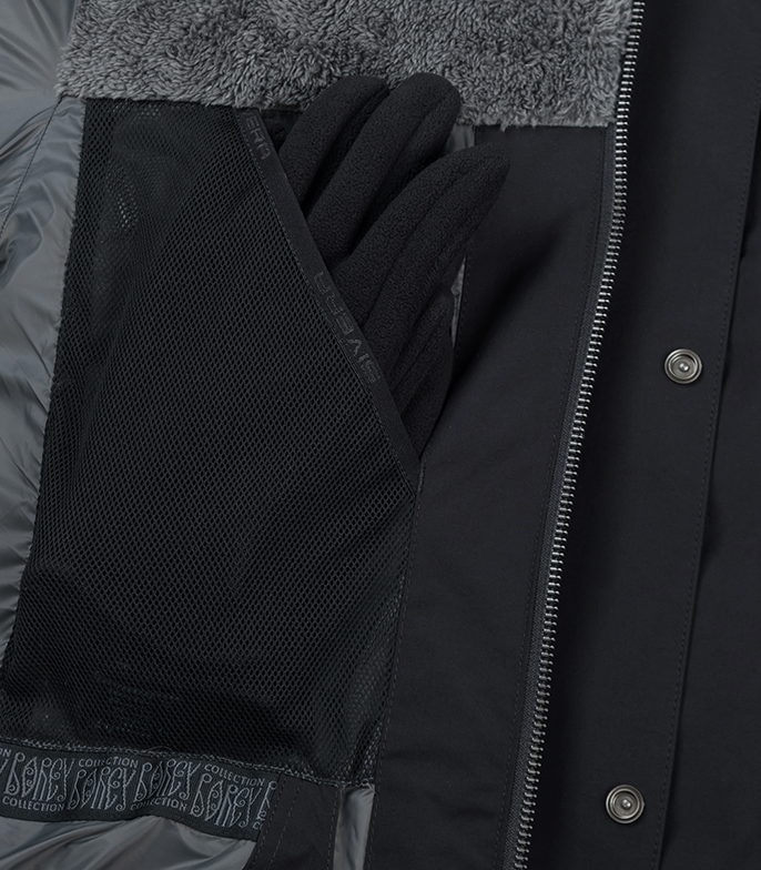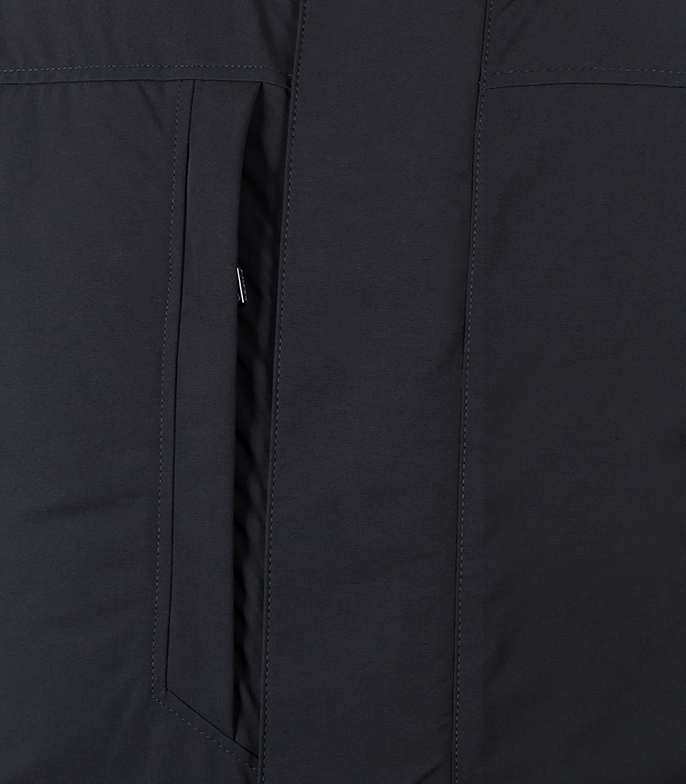 на молнии. Один нагрудный утеплённый карман на молнии с входом под планкой. Два боковых тёплых кармана для рук на молнии.